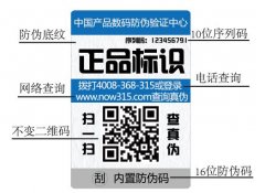 上海尚源防偽采用數碼防偽原理,即電碼防偽。為每一件入網的產品設置一個獨一的編...